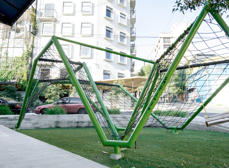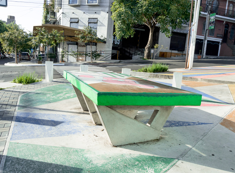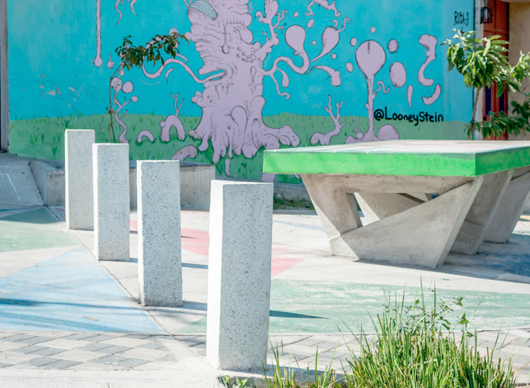 Mesa de ping pong de concreto, bolardos, biciparqueos y juego para niños. Este proyecto diseñado por la Alcaldía Auxiliar de la Zona 4 y ejecutado por Innovation Group, obtuvo el Primer Lugar en los Premios Danta 2016 organizado por FERCO, en la categoría de Diseño Urbano.